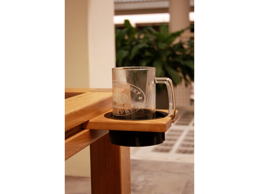 Konstrukce držáku je vyrobena z masivu tl. 20 mm. Materiál volíme podle materiálu stolu (Dub, Jasan, Javor). Miska je nerezová a pro snadnou údržbu, se dá jednoduše vytáhnout a zase vrátit zpět.