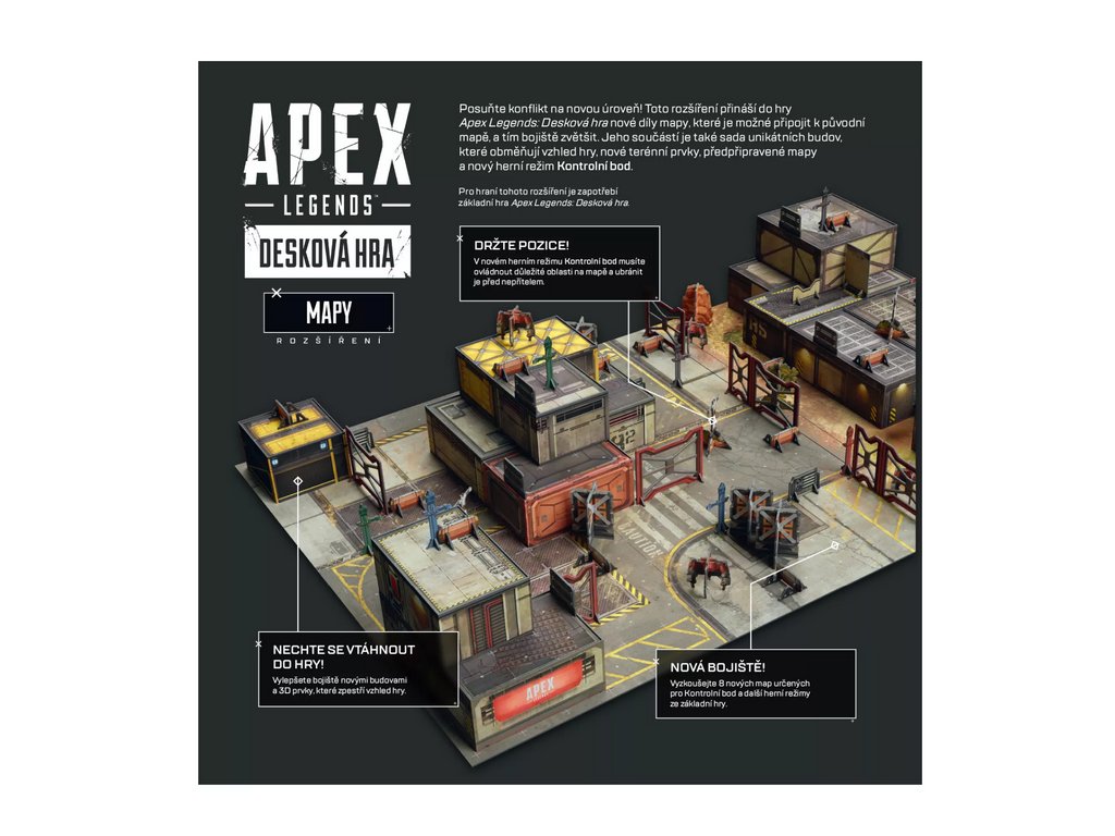 Posuňte konflikt na novou úroveň! Mapové rozšíření přidává nové herní dílky pro použití ve hře Apex Legends: The Board Game, které vycházejí z průmyslového tématu Kings Canyon a nabízejí nové budovy a terénní prvky, včetně plotů, které fungují jako nepřekonatelné překážky. Novou desku lze připojit k výchozí desce pomocí sady spojovacích dílků, což zvětšuje potenciální bojiště.