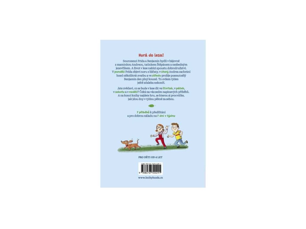 - Jste zvědaví, co se bude v lese dít ve čtvrtek, v pátek, v sobotu a v neděli? Čeká na vás sedm napínavých příběhů. A na konci knihy najdete hru, se kterou si procvičíte, jak jdou dny v týdnu pěkně za sebou.