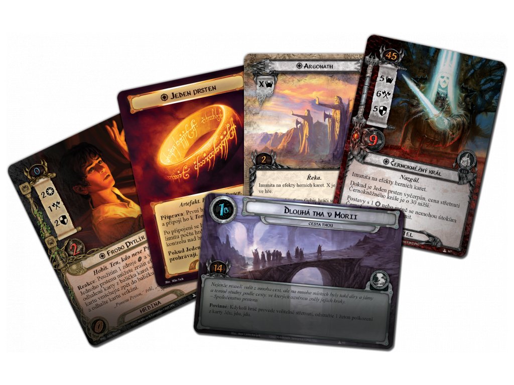 více než 60 herních karet a karet hrdinů, se kterými můžete sestavit nebo doplnit balíčky karet pro libovolný ze scénářů či kampaní Pána prstenů: karetní hry.