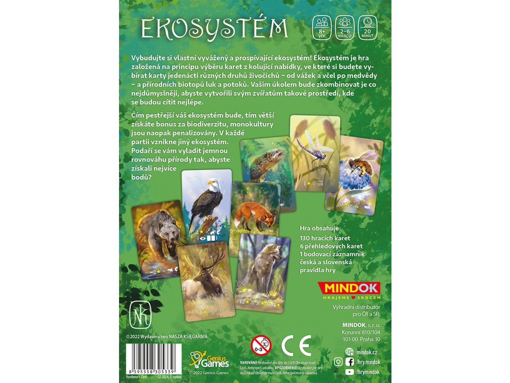 Ekosystém je karetní hra pro 1-6 hráčů, ve které si každý buduje vlastní ekosystém plný rozmanitých živočichů a prostředí. Pomocí mechanismu draftu si budete vybírat karty a strategicky je umisťovat do své mřížky 5×4.