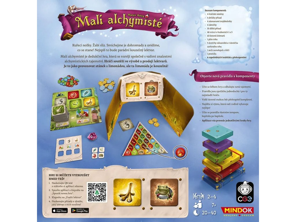 Malí alchymisté jsou deduktivní rodinná hra, která má podnítit zvídavost malých hráčů! Ti v ní budou kombinovat různé ingradience, aby vytvářeli všemožné lektvary. A pokud se jim bude dařit, otevřou tím další kapitolu. S každým uvařeným lektvarem se tak ponoří o něco hlouběji do tajů alchymie. Hra využívá aplikace, ve které budete scanovat jednotlivé ingredience a která vám bude zobrazovat výsledky vašich pokusů. Hra obsahuje celkem sedm kapitol, všechny jsou ale plně znovuhratelné a můžete se tak k nim různě vracet. Vydejte se poznávat taje alchymie!