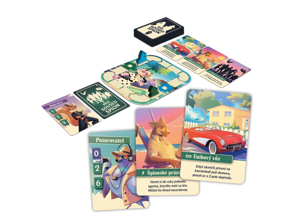 Můj soused špion je rychlá deduktivní hra pro dva až čtyři hráče, kteří se budou snažit přechytračit své protivníky. Hra obsahuje karty s různými efekty či bodovými hodnotami, přičemž hráč na tahu nabízí kartu skrytě a odkrytě a druhý si volí, kterou z nich si vezme. Hra je závod okolo bloku a karty s vysokou hodnotou vám dovolí přiblížit se k protivníkovi. Některé karty mají hodnotu až v rámci sady, ale vyplatí se na ně počkat. Hra Můj soused špion má roztomilé ilustrace, jednoduchá pravidla, ale pořádně procvičí vaše blafovací schopnosti i odhad!