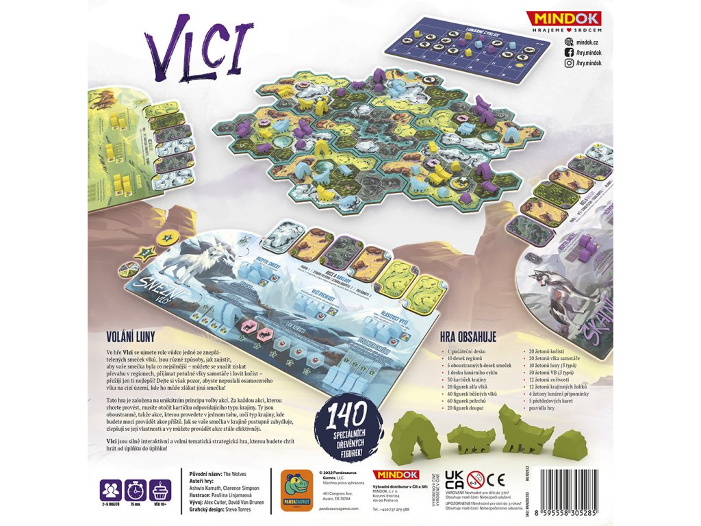 Vlci jsou desková hra, ve které se každý z hráčů snaží vybudovat svou vlčí smečku a ovládnout s ní co největší teritorium. V průběhu hry budete získávat více vlků, sbírat kořist, stavět doupata, ale také zlepšovat atributy vaší smečky. Hra Vlci je postavena na chytrém mechanismu, kdy vlky aktivujete na základě jednotlivých možných terénů. A obsahuje i slušnou míru interakce, protože pořádným zavytím k sobě můžete přilákat i soupeřovy vlky!
