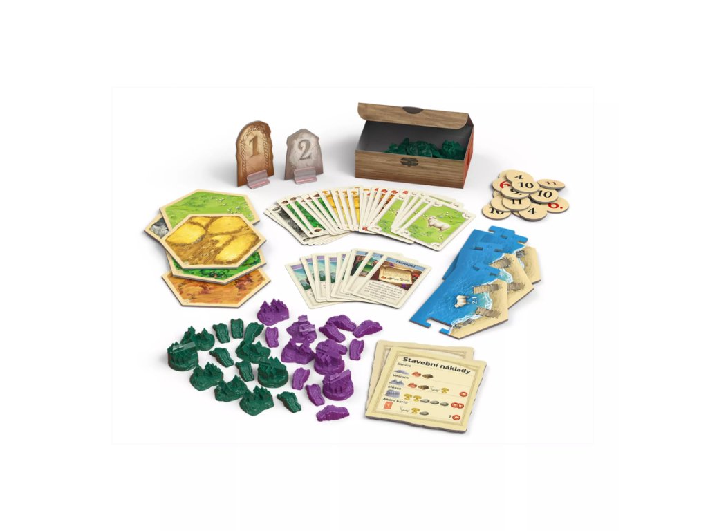 - Základní hru Catan - 19 dílů krajin, 6 částí rámu, 18 žetonů s čísly, 4 karty stavebních nákladů, 2 zvláštní karty, 95 karet surovin, 25 akčních karet, 96 hráčských figurek, 1 figurku zloděje, 2 kostky, 4 krabičky na figurky, 2 přihrádky na karty, 1 almanach, 1 pravidla.