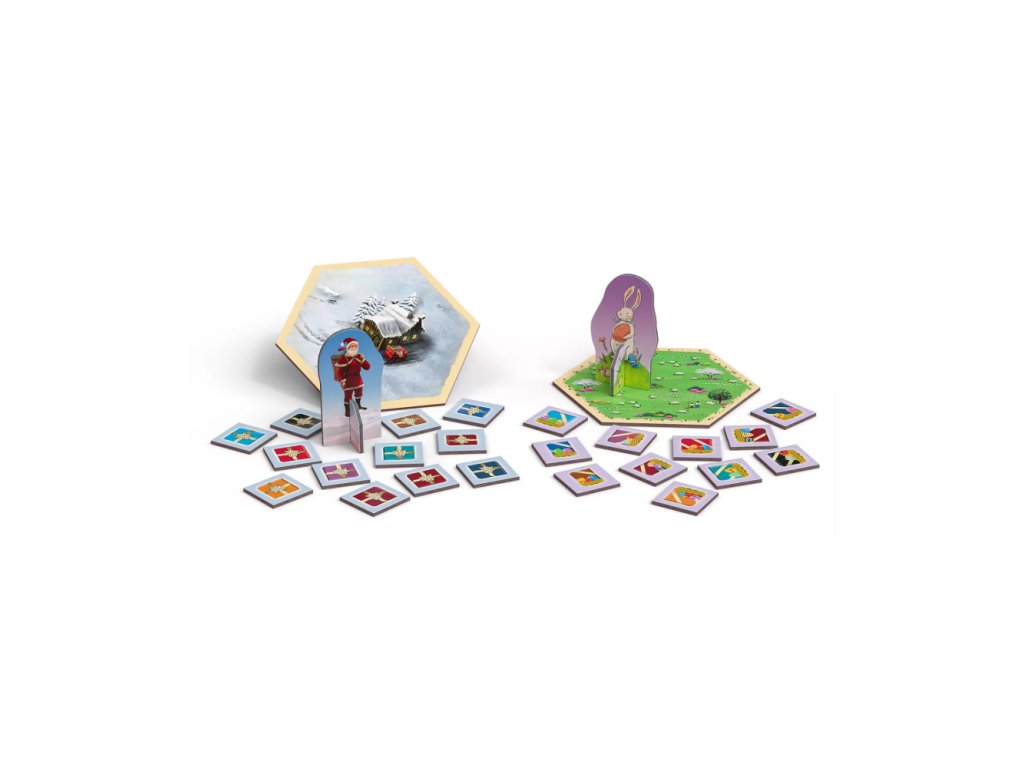 - Scénáře - 84 žetonů přízně, 1 desku cechů, 16 žetonů Catanu, 1 zvláštní oboustranný díl krajiny, Velikonoční louka/Domek Santa Clause, 11 žetonů dárků, 19 destiček rikš, 1 figurku velikonočního zajíčka, 1 figurku Santa Clause, 1 oboustranný herní plán.