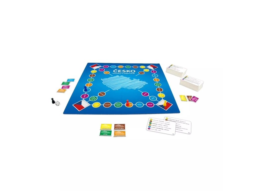 Hra Česko - otázky a odpovědi obsahuje: 1 herní plán, 400 karet, 36 žetonů, 6 figurek, 1 kostku a pravidla.