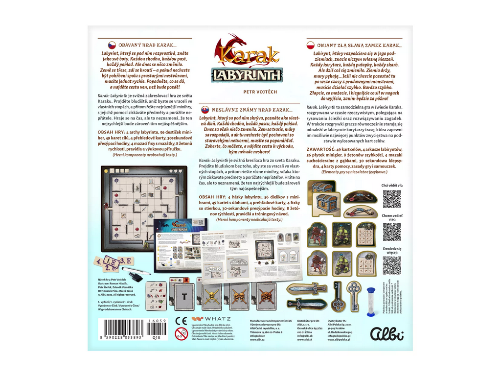 Karak: Labyrinth je svižná zakreslovací hra ze světa Karaku určená pro hráče od 6 let. Každý hráč prochází svým vlastním bludištěm, zakresluje cesty, řeší chytré minihry a sbírá předměty, které mu pomohou porazit nebezpečné příšery. Všichni hrají současně – a tak rozhoduje nejen rychlost, ale i bystrá hlava a rozvaha.