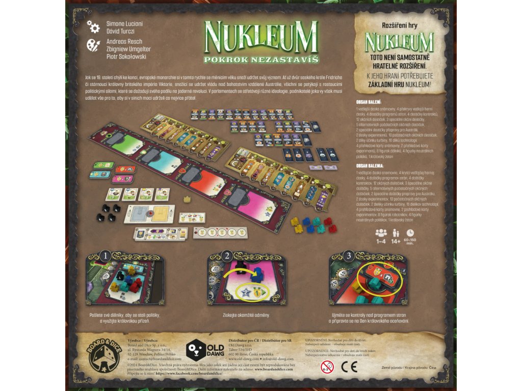 POKROK NEZASTAVÍŠ je druhé rozšíření pro komplexní euro hru Nukleum, které přinese novou mechaniku politických stran, která jednak přidává element area majority, druhak výrazně vylepšuje a posiluje efekt Dne královského oceňování. Navíc přinese dva nové experimenty, nové akční dílky a kontrakty. Vše krom bočnic krabice je lokalizované (polep přední i zadní strany, pravidla, nápovědní karty