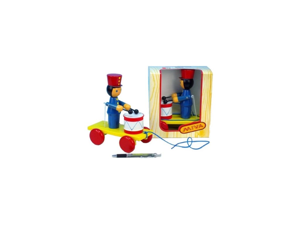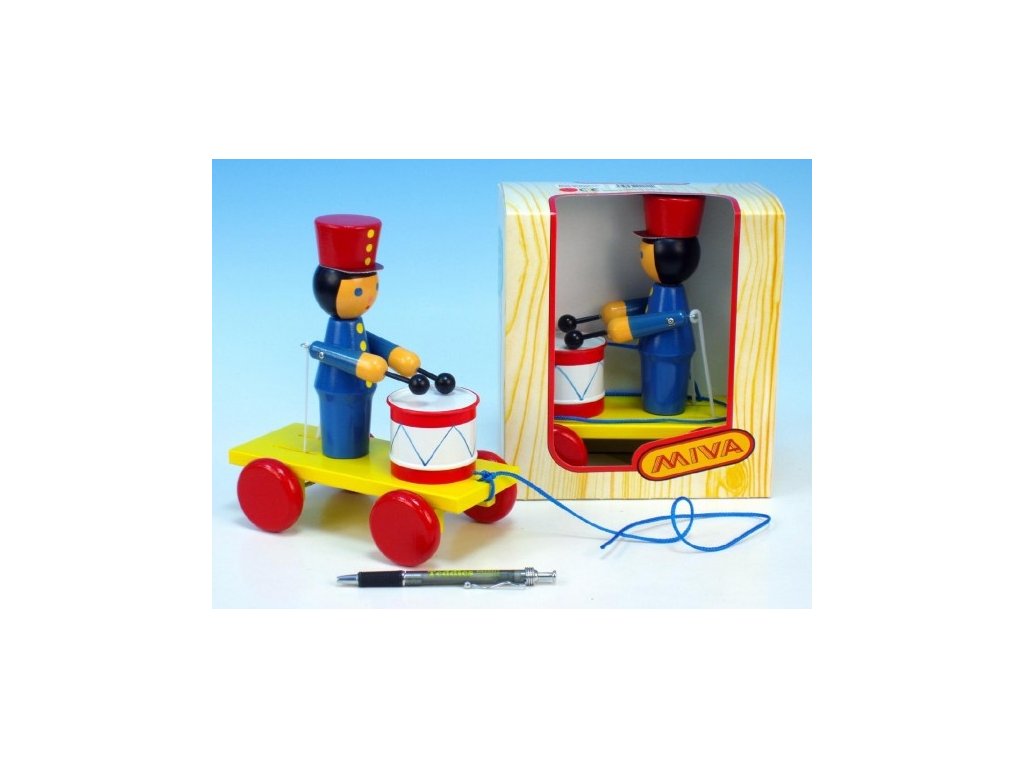 Dřevěná tahací hračka, která při pohybu vydává zvuk. Otáčející se zadní kolečka přenášejí pohyb na ručičky figurky, které pak tlučou do bubínku a to vydává příjemný tlumený zvuk. Povrch hračky je hladce upraven a jsou použity zdravotně nezávadné a certifikované barvy. Hračka je ideální hlavně pro malé děti.